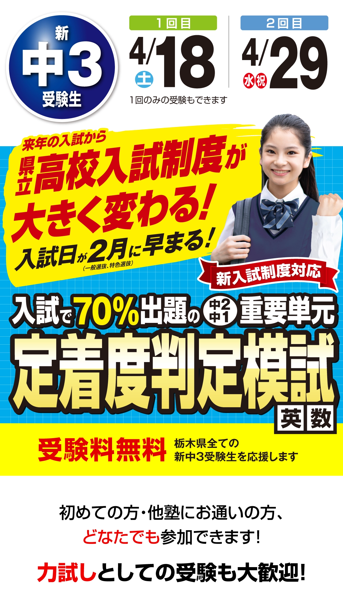 | 受験料 | 「新入試制度」受験対策応援!《受験料無料》 | ||||
